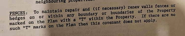 I wanted to check if I have interpretated my Title plan for my house correctly<br> <br> I have red edging on the left hand side of my garden fence which subtly overlaps the fence, so I think thats my fence, however it does overlap the right hand side. So is that my neighbours responsibility? Neither have a T mark oddly.<br> <br> However there is a T mark at the front of the house boundary - is that just to indiciate everything within the red line is mine? Or everything line only with a T mark line is mine?