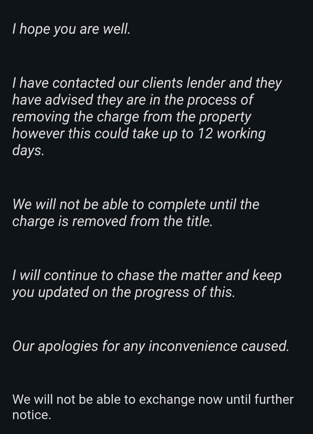 We were in the process of exchanging but was told a restriction charge was in place.<br> <br> <br> The sellers solicitor has confirmed the seller's lender is the process of removing the charge from the property, however this will take up to 12 working days.<br> <br> Adam can you please confirm an application has been put forward and if it has been expedite to speed up the process.<br> <br> Much appreciated 🙏 <br> <br> Kind regards <br> Jay